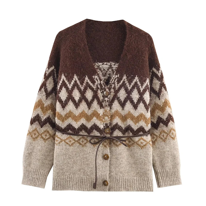 Women Knitted Midi Skirts Two Piece Sets 2025 New Fashion Jacquard Belt Knit Cardigan Women's Suits Autumn Winter Woman Outfits